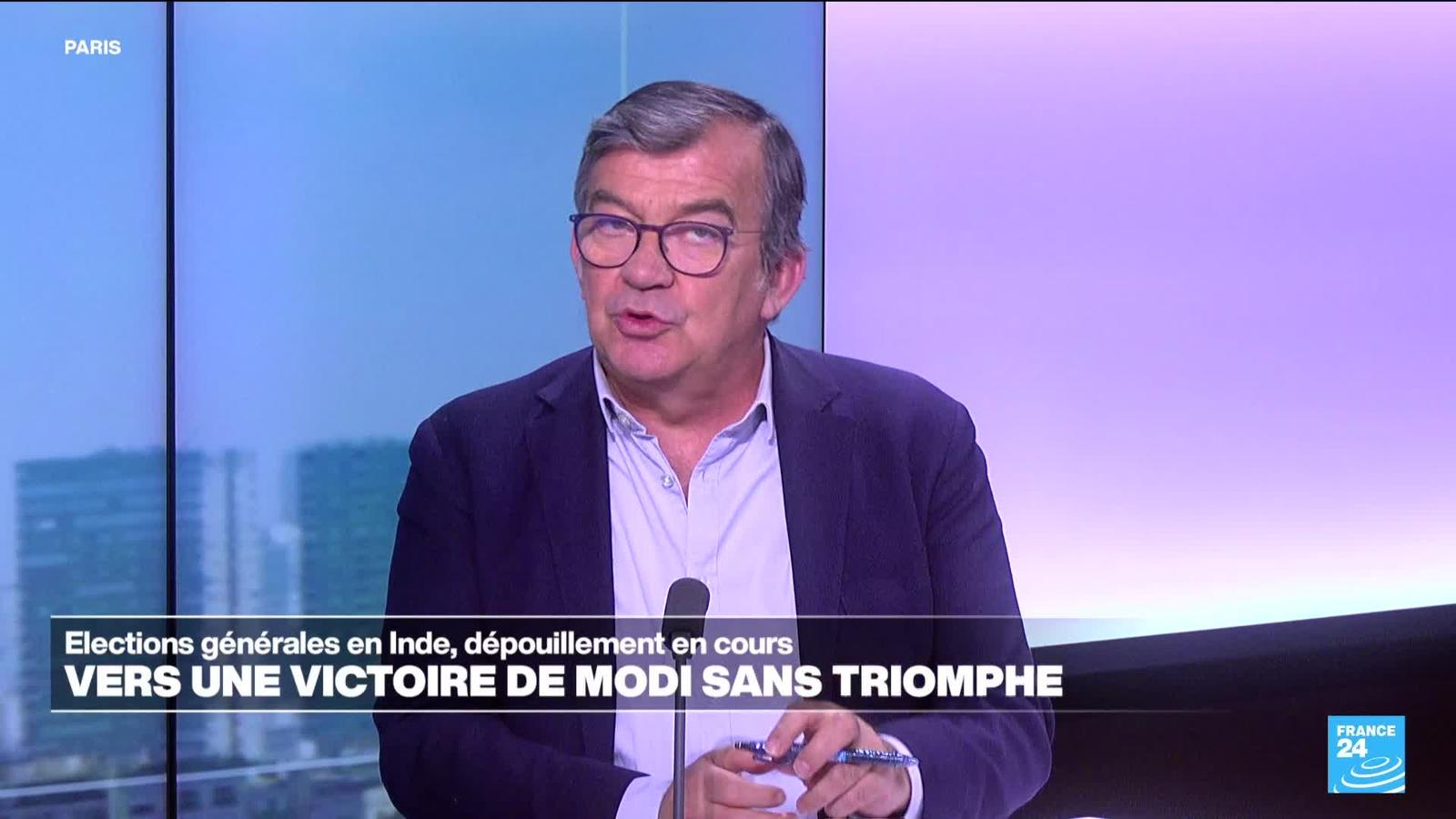 Narendra Modi espère décrocher mardi un troisième mandat à la tête de l'Inde au terme d'un marathon électoral marqué par l'affaiblissement de l'opposition et la montée des inquiétudes concernant les droits des minorités. Selon la commission électorale, le parti nationaliste hindou du Premier ministre arrive en tête avec 38,7 % des voix après dépouillement de la moitié des bulletins. Les explications de Bruno Daroux, chroniqueur international France 24.