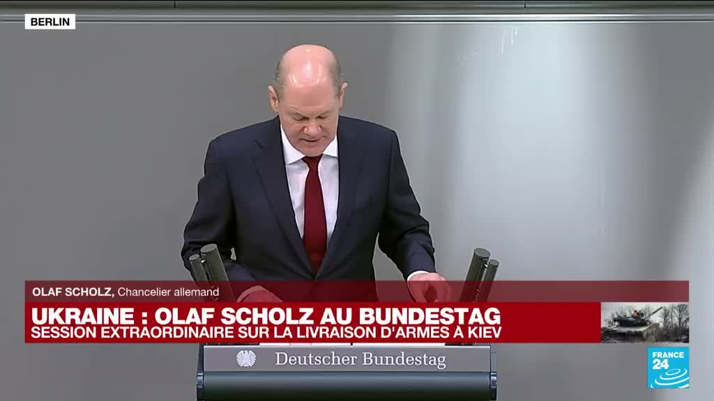 Face à la violente offensive russe en Ukraine, Berlin a autorisé, samedi 26 février, la livraison à Kiev de 1.400 lance-roquettes antichar, de 500 missiles sol-air Stinger et neuf obusiers. Un véritable tournant de la politique allemande en matière d'engagement militaire. Le chancelier allemand Olaf Scholz s'est exprimé au Bundestag lors d'une session extraordinaire ce dimanche 27 février. Il a annoncé une hausse du budget accordé à la Défense et une enveloppe de 100 milliards d'euros pour moderniser l'armée allemande.