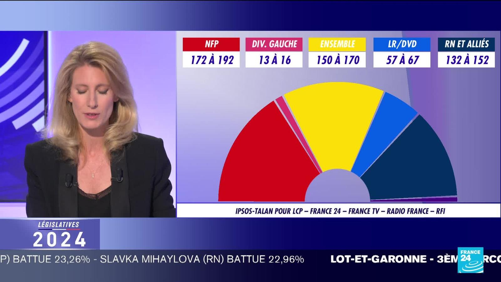 D’après les premières estimations suite aux élections législatives 2024, le Nouveau Front Populaire serait en tête avec 172 à 192 sièges, suivi du parti Ensemble avec 150 à 170 sièges et du Rassemblement National avec 132 à 152 sièges. Clovis Casali, journaliste France 24, est au QG du RN, à Vincennes. Suivez les interventions et analyses de cette soirée électorale sur France 24-LCP en intégralité : https://www.youtube.com/live/JRWd_uOnbF4?si=e8KLBBQdgDxlDxL1