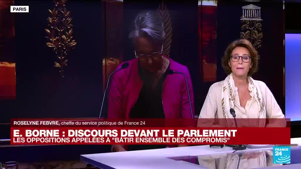 Pour son baptême du feu devant l'Assemblée nationale, Elisabeth Borne, qui avait affiché l'image de la sérénité en se rendant à pied au Palais-Bourbon avec une partie de ses ministres, a livré une feuille de route sous le sceau du "compromis", affirmant avec force sa détermination à avancer malgré une majorité relative qui la bride. L'analyse de Roselyne Febvre, cheffe du service politique de France 24.