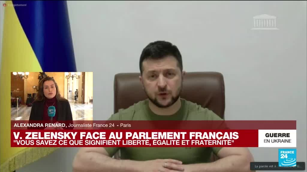 Le président ukrainien Volodymyr Zelensky s'est adressé mercredi 23 mars au parlement français, déclarant attendre de la France qu'elle aide l'Ukraine à mettre fin à cette "guerre contre la liberté, l'égalité et la fraternité" et à adhérer à terme à l'Union européenne. Les députés et sénateurs ont été touché par ce discours, comme l'explique Alexandra Renard, envoyée spéciale sur place pour France 24.