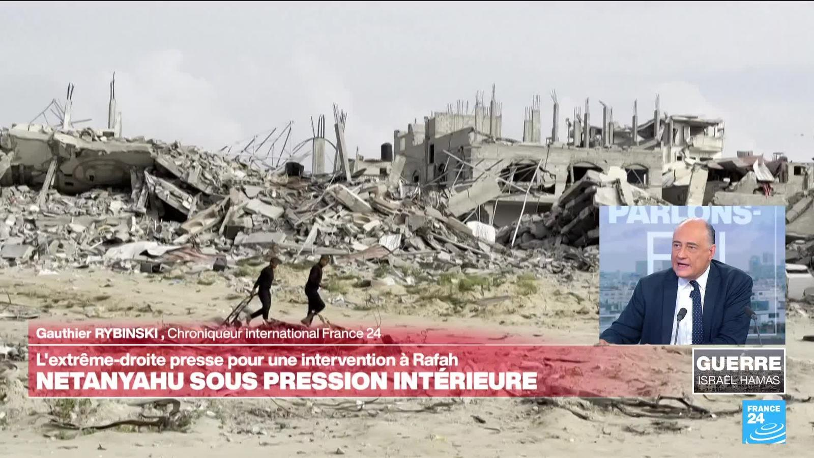 Le Premier ministre israélien Benjamin Netanyahu a annoncé lundi qu'une date avait été fixée pour une offensive sur Rafah, dans le sud de la bande de Gaza, malgré l'opposition de Washington, à l'heure où le Hamas et Israël tentent de se mettre d'accord sur une trêve. Le mouvement islamiste palestinien examine une proposition en trois étapes remise par les pays médiateurs, dont la première prévoit un cessez-le-feu de six semaines, a indiqué une source au sein du Hamas. Le décryptage de la situation avec Gauthier Rybinski, chroniqueur international à France 24.