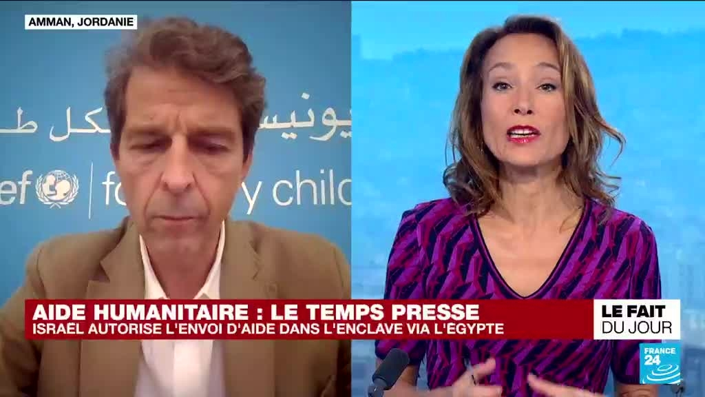 Après 12 jours de siège imposé aux Gazaouis depuis l’attaque du Hamas du 7 octobre, le président américain Joe Biden en visite à Tel-Aviv a obtenu d’Israël de laisser entrer l’aide humanitaire dans la bande de Gaza depuis l’Egypte. Comment acheminer cette aide et dans quelles circonstances ? Pour Marc Rubin, directeur adjoint du bureau régional de l’UNICEF, invité de France 24, "l’aide est prête mais les conditions doivent être mises en place pour un approvisionnement en toute sécurité pour les populations civiles et pour les travailleurs humanitaires."