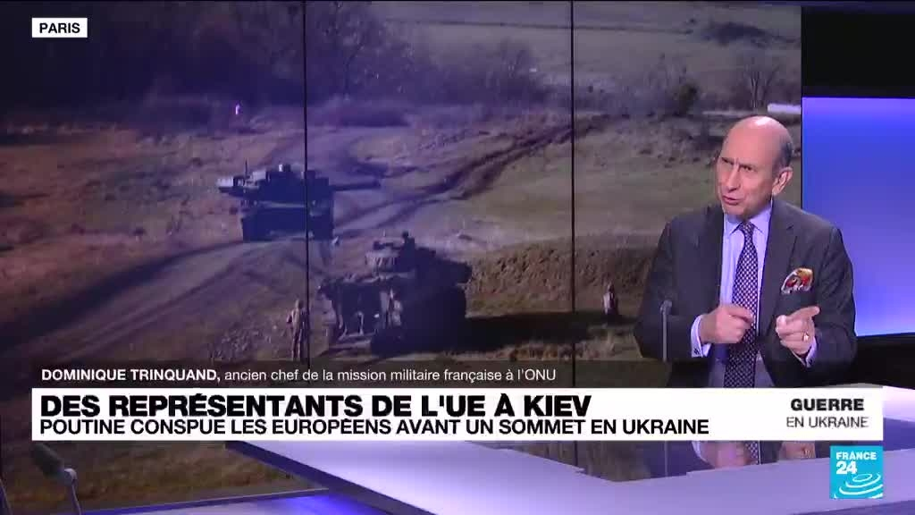 La présidente de la Commission européenne, Ursula von der Leyen, est arrivée jeudi à Kiev, accompagnée d'autres membres de l'exécutif européen, dont Josep Borrell, pour une visite destinée à afficher le soutien de l'UE. Les précisions de Dominique Trinquand, ancien chef de la mission militaire française à l'oNU.