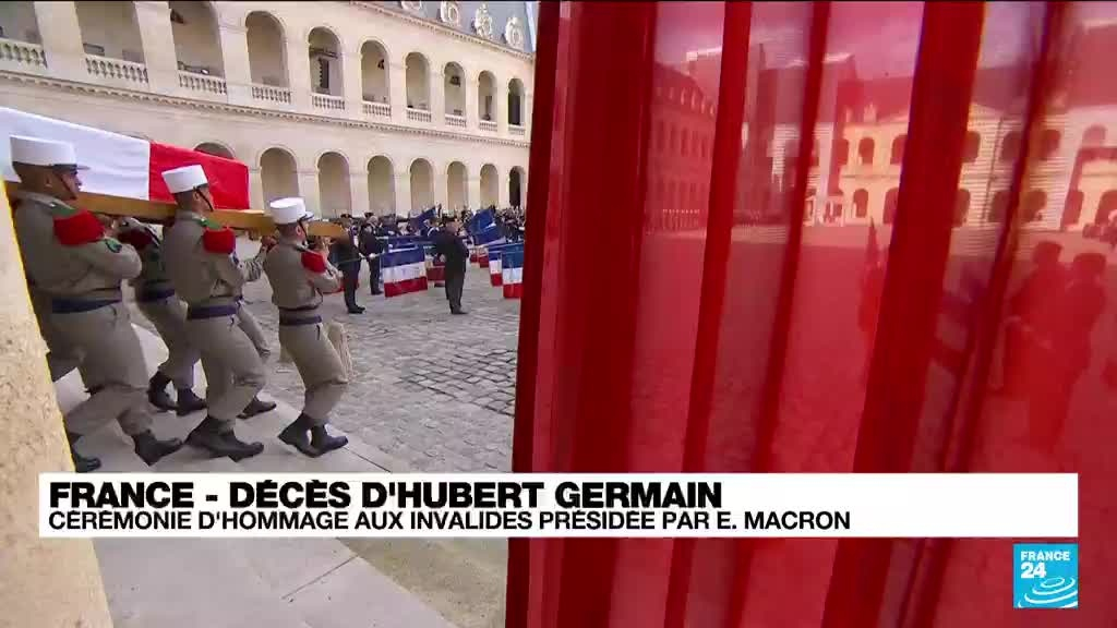 Le cercueil d'Hubert Germain, décédé à 101 ans, arrive aux Invalides, lors d'une cérémonie présidée par Emmanuel Macron.