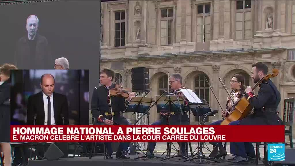 Le peintre français Pierre Soulages a reçu mercredi 2 novembre un hommage national présidé par Emmanuel Macron dans la cour carrée du Louvre, une semaine après son décès à l'âge de 102 ans. Etaient présents autour du président, des membres du gouvernement et la famille de l'artiste mondialement connu pour ses tableaux aux nuances infinies de noir. Pascal Rousseau, professeur d'histoire de l'art à Panthéon-Sorbonne, était sur le plateau de France 24 pour commenter la cérémonie.