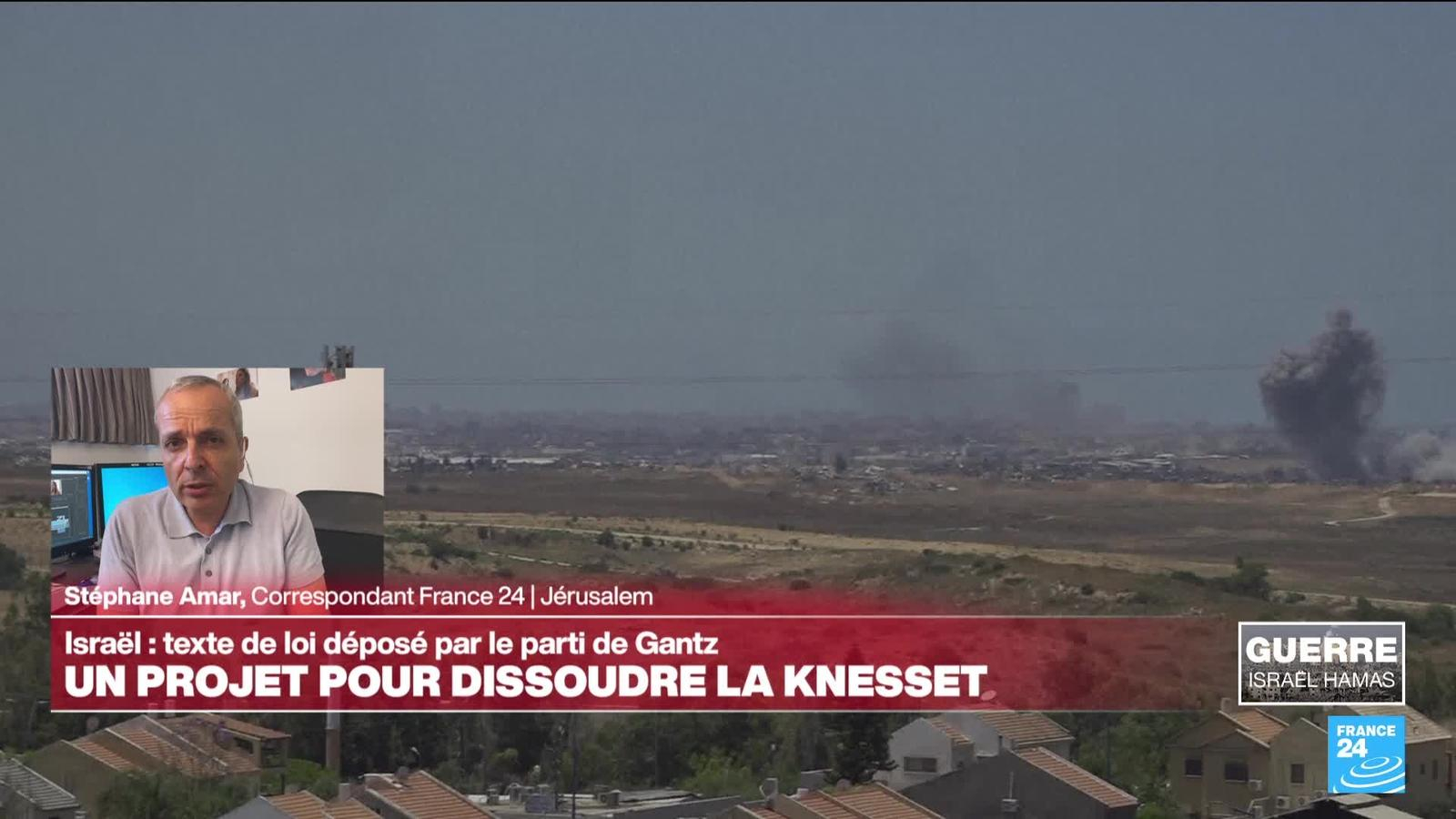 Le parti de Benny Gantz, membre du cabinet de guerre israélien, a déposé jeudi 30 mai un projet de loi pour dissoudre le Parlement et tenir des élections anticipées. Cela fait suite à la demande du chef du parti Benny Gantz d'aller de l'avant dans le cadre d'un large accord en vue de la tenue d'élections avant le mois d'octobre, un an après le massacre" du 7 octobre, selon un communiqué du parti. Les précisions de Stéphane Amar, correspondant de France 24 à Jérusalem.