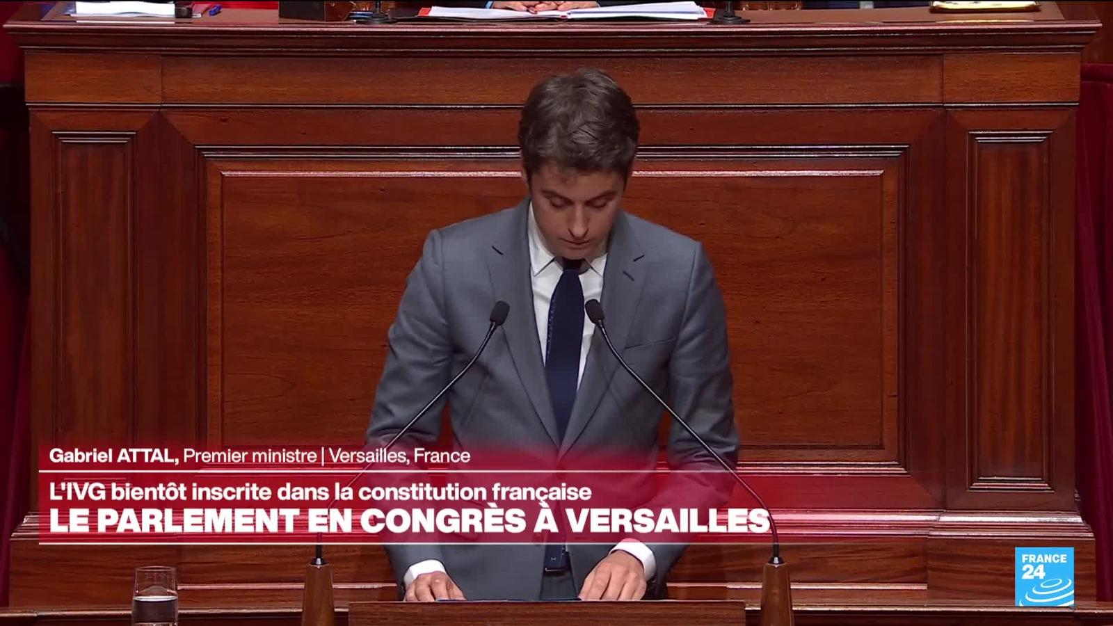 Le Parlement est réuni ce lundi après-midi en Congrès pour faire de la France le premier pays au monde à inscrire explicitement dans sa Constitution l'interruption volontaire de grossesse (IVG). Avant l'ouverture des débats, le Premier ministre Gabriel Attal s'est exprimé. Il a notamment salué une "étape fondamentale" qui "restera dans l'Histoire". Et d'ajouter : "Nous avons une dette morale" envers toutes les femmes qui "ont souffert dans leur chair".