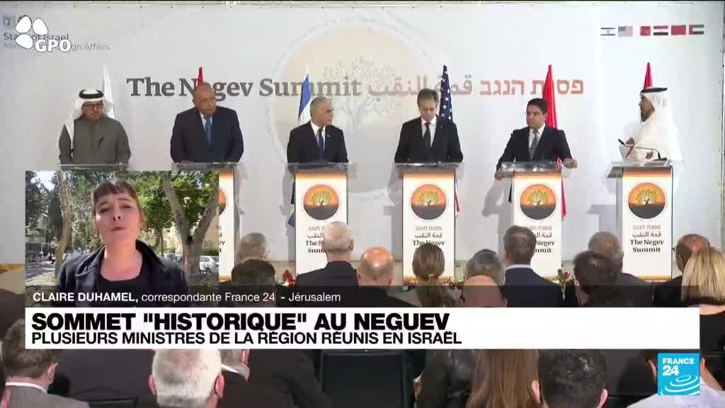 L'alliance entre Israël et des pays arabes envoie un message fort à l'Iran, a déclaré lundi le chef de la diplomatie israélienne Yaïr Lapid à l'issue d'une rencontre inédite dans le sud israélien. Les précisions de Claire Duhamel, correspondante pour FRANCE 24 à Jérusalem.