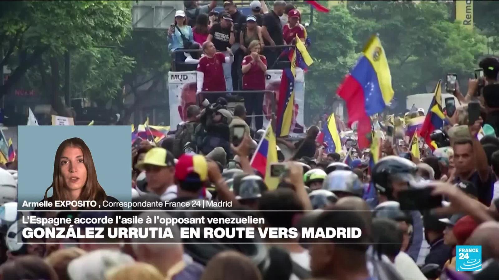 Madrid va accorder l'asile politique au candidat de l'opposition vénézuélienne à la présidentielle, Edmundo Gonzalez Urrutia, qui s'exile dimanche en Espagne après un mois de clandestinité dans son pays plongé dans une crise profonde. Précisions d'Armelle Exposito, correspondante France 24 à Madrid.