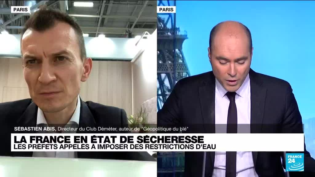 Le ministre de la Transition écologique Christophe Béchu, qui réunissait lundi 27 février les préfets coordinateurs de bassin pour évoquer la sécheresse hivernale inédite en France, les a appelés à prendre des arrêtés de restriction d'eau "dès maintenant" pour anticiper d'éventuelles situations de crise pendant l'été. Sébastien Abis, directeur du Club Déméter, auteur de "Géopolitique du blé", était sur France 24 pour évoquer le sujet.
