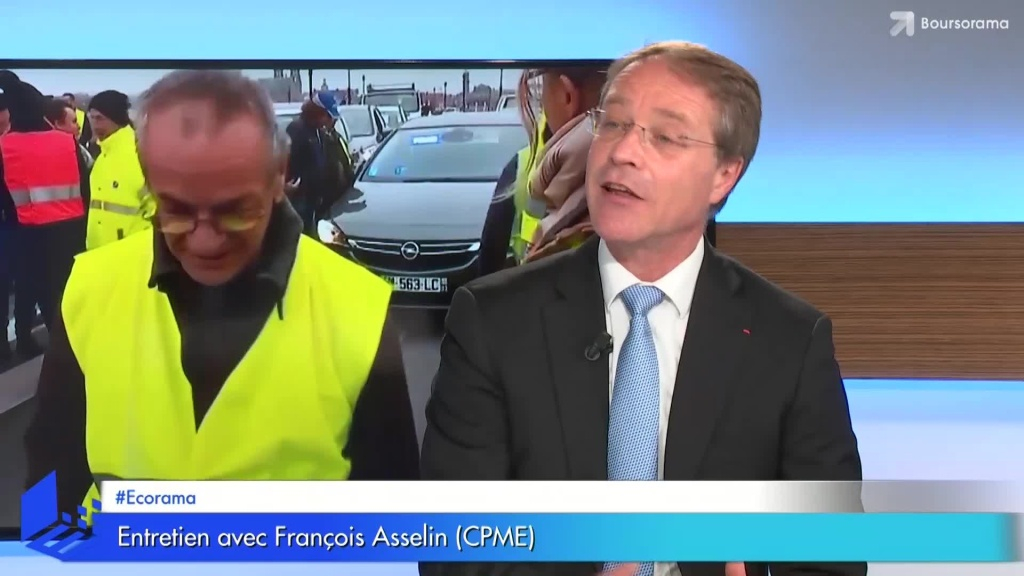 Taxe flexible sur les carburants, impact du mouvement des gilets jaunes sur l'activité, moral des français en chute libre : François Asselin, président de la CPME réagit à l'actualité économique et politique. Ecorama du 28 novembre 2018, présenté par David Jacquot sur boursorama.com