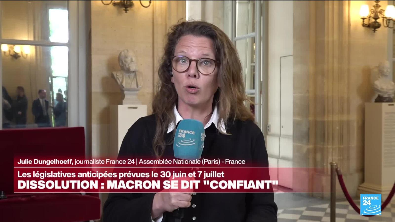 Le président Emmanuel Macron a annoncé dimanche 9 juin la dissolution de l'Assemblée nationale en France, un coup de tonnerre déclenché peu après l'annonce des résultats des élections européennes donnant une large avance au Rassemblement national (RN). Une nouvelle campagne électorale démarre. Julie Dungelhoeff, journaliste à France 24, était à l'Assemblée nationale ce lundi matin.