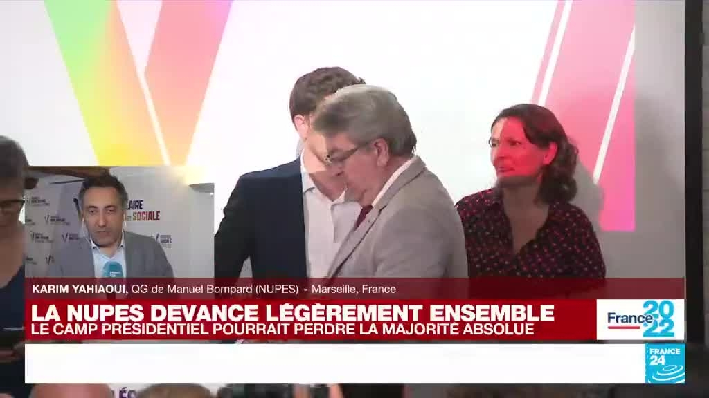 La coalition de gauche menée par Jean-Luc Mélenchon a réalisé une percée spectaculaire dimanche aux élections législatives, lui permettant d'être au même niveau que le camp macroniste et d'espérer priver Emmanuel Macron de majorité absolue. Karim Yahiaoui est au QG de Manuel Bompard à Marseille.