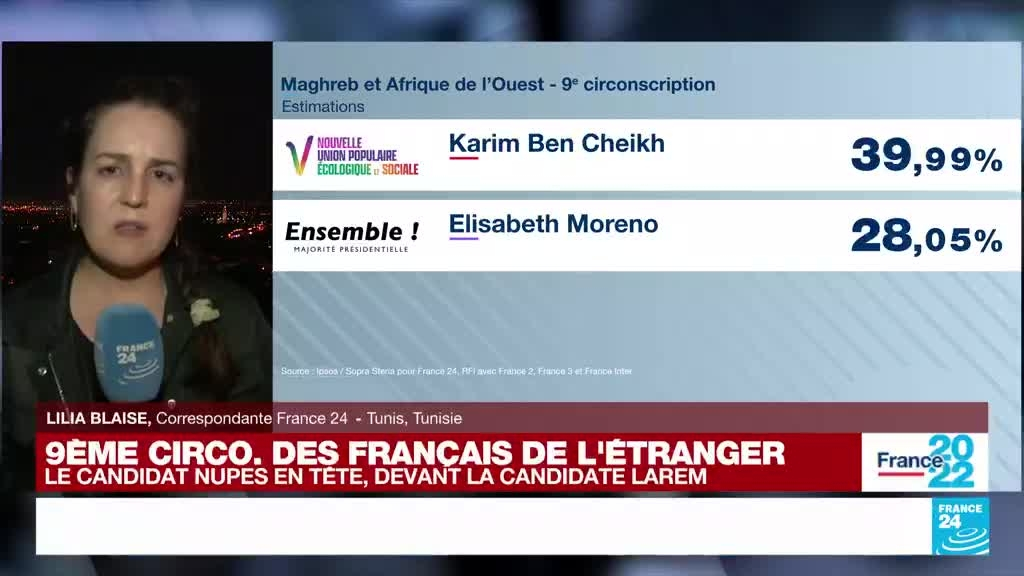 Le candidat NUPES Karim Ben Cheikh est arrivé en tête dans la 9e circonscription des Français de l'étranger, devant la candidate LaREM, Elisabeth Moreno. Les précisions de Lilia Blaise, correspondante pour France 24, en Tunisie.