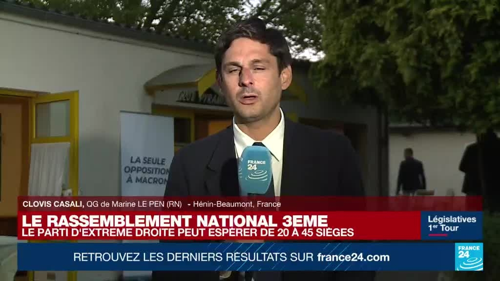 Marine Le Pen est arrivée en tête de sa circonscription du Pas-de-Calais, avec un score estimé à 53,96 %, au premier tour des élections législatives. "Pas de fête ce soir au QG du RN" malgré la bonne position de la candidate RN, rapporte Clovis Casali, journaliste pour France 24.