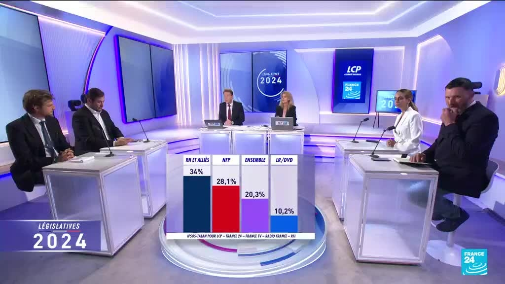 D'après les premières estimations de résultats d'Ipsos Talan, le Rassemblement national arrive en tête du premier tour avec 34% des votes, suivi par le nouveau Front populaire avec 28,1 % et le camp présidentiel avec 20,3 %. Andréa Kotarac, porte parole du Rassemblement national commente ces premiers résultats sur le plateau de France 24.