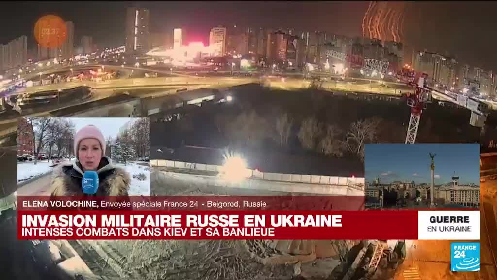 L'armée ukrainienne et les forces russes s'affrontent à Kiev samedi matin pour le contrôle de la capitale de l'Ukraine, deux jours après le lancement d'une invasion du pays ordonnée par Vladimir Poutine. Elena Volochine, envoyée spéciale pour FRANCE 24 en Russie, fait le point.