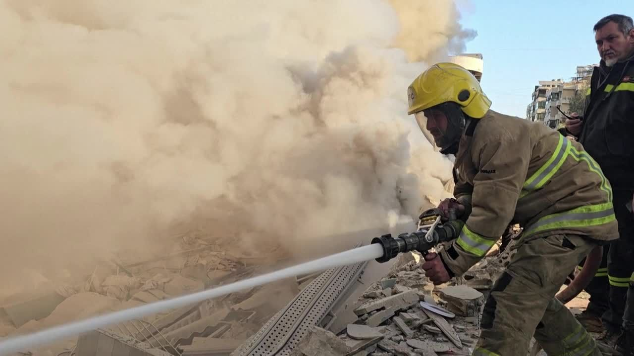 Les pompiers s'efforcent de maîtriser les incendies tandis que d'épaisses fumées s'élèvent dans le ciel suite aux frappes israéliennes sur la banlieue sud de Beyrouth.