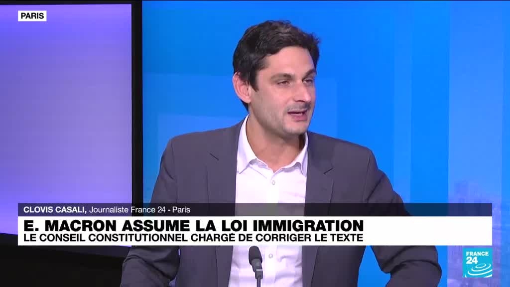 Après l'adoption du projet de loi immigration dans la douleur, la majorité présidentielle était prise jeudi entre le feu de la droite et l'extrême droite, soucieuses que le texte soit exécuté à la lettre, et celui de la gauche, qui conjure Emmanuel Macron de ne pas l'appliquer. Le président a saisi le Conseil constitutionnel qui pourrait retoquer des dizaines de mesures chères à la droite et l'extrême droite, comme le conditionnement des prestations sociales ou le durcissement du regroupement familial. Les précisions de Clovis Casali, journaliste à France 24.