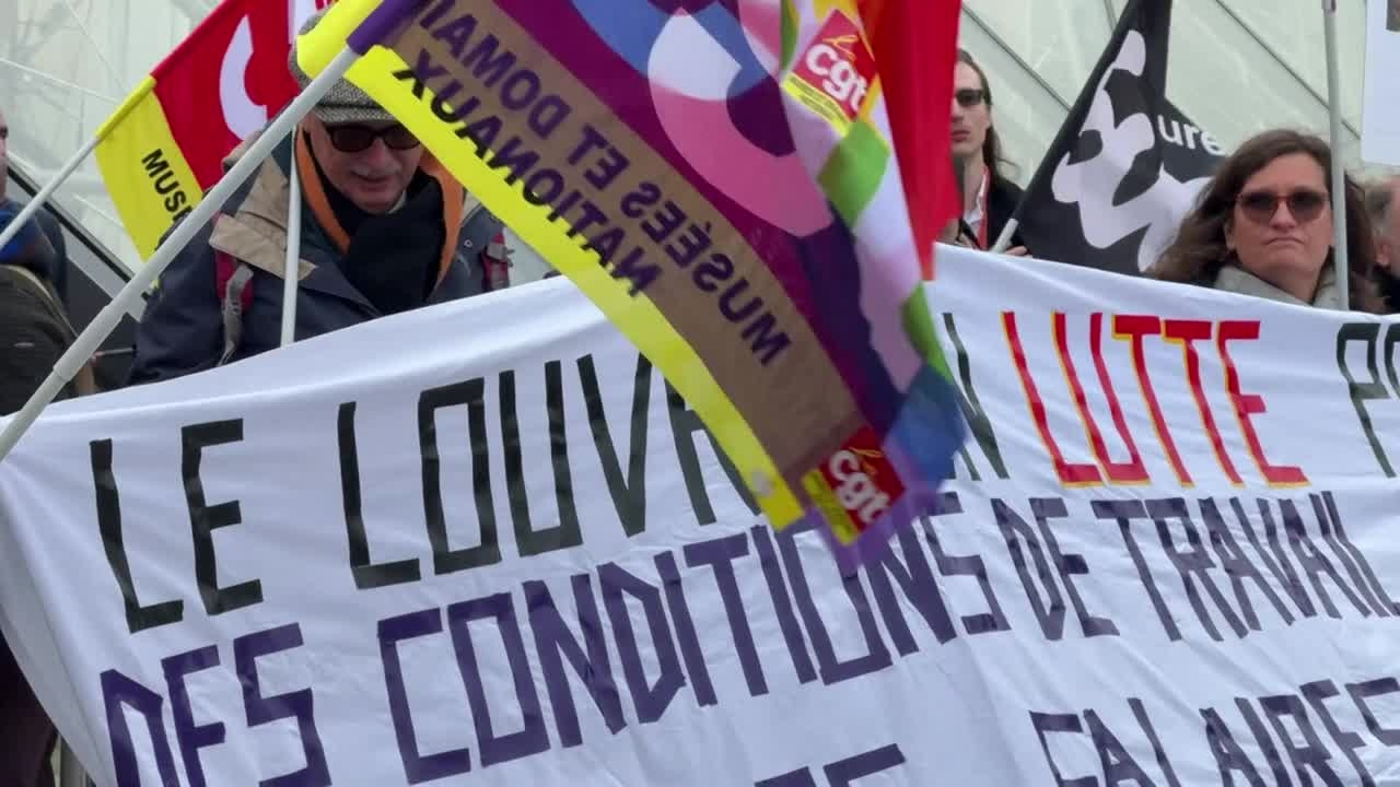 Les syndicalistes manifestent à l'extérieur du musée du Louvre à Paris, après l'annonce de la reconduction de la grève des salariés qui demandent de meilleures conditions de travail et d'accueil du public. C'est une nouvelle épreuve pour un établissement en crise dont la présidente sera de nouveau entendue en fin de journée au Sénat. IMAGES
