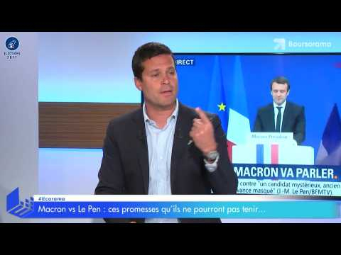 Respect des 3% du déficit public, prélèvement à la source, taxation des importations, sortie de l'euro : passage en revue des principales mesures d'Emmanuel Macron et de Marine Le Pen qui ne pourront pas être appliquées avec Xavier Timbeau, directeur de l'OFCE. Ecorama du 24 avril 2017 présenté par David Jacquot, sur Boursorama.com.