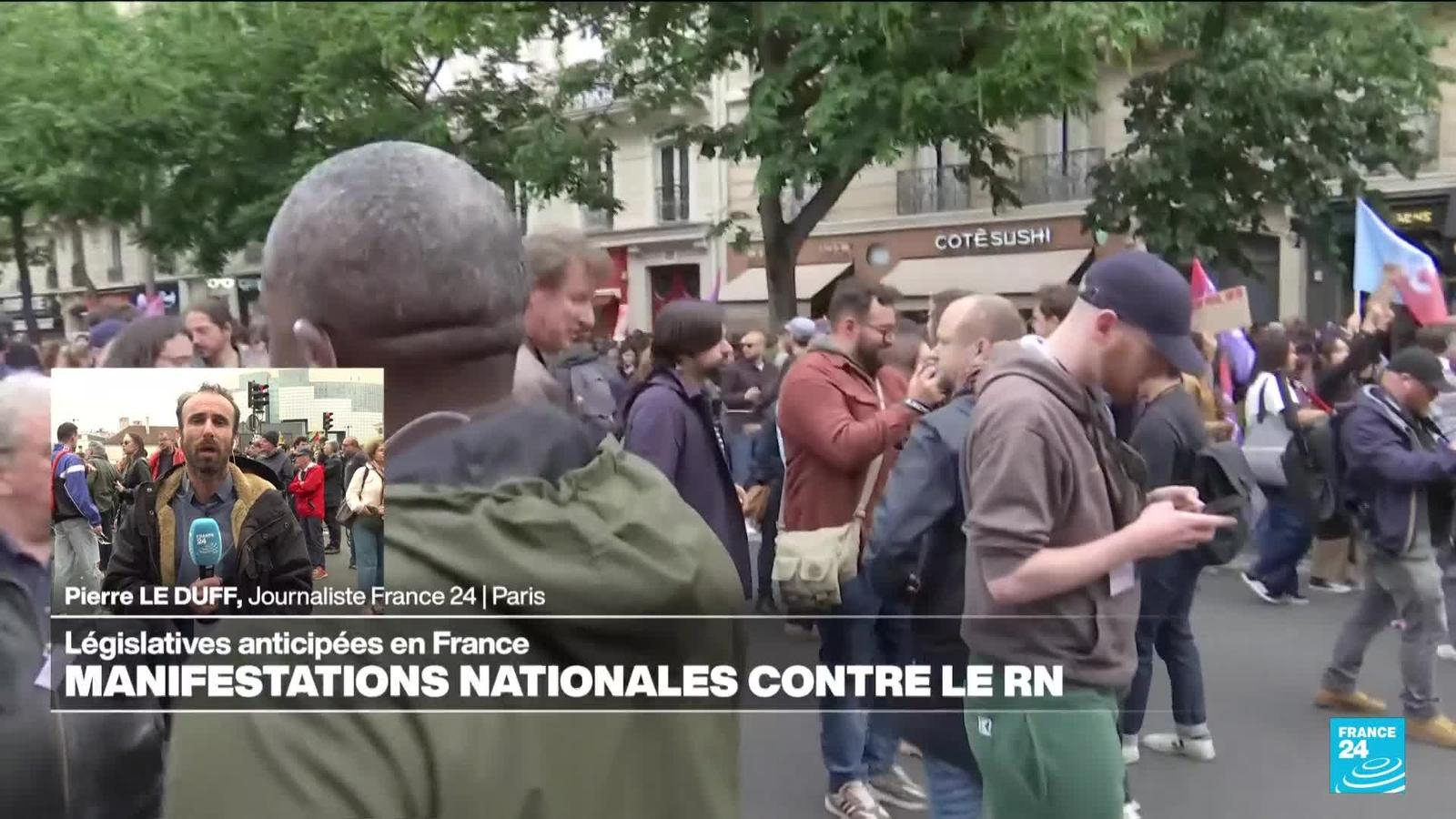 Journaliste à France 24, Pierre Le Duff est présent dans la manifestation contre l'extrême droite qui se tient à Paris, à une quinzaine de jours du premier tour des élections législatives en France. Parti de la Place de la République, ce cortège est sur la Place de la Bastille et doit rejoindre la Place de la Nation.
