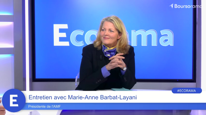 Marie-Anne Barbat-Layani, présidente de l'Autorité des marchés financiers (AMF), était l'invitée de l'émission Ecorama du 24 février 2026, présentée par David Jacquot sur Boursorama.com. Parmi les sujets abordés : la construction d'un véritable marché de capitaux européen, la régulation des cryptoactifs avec l'entrée en vigueur de MiCA, la lutte contre les arnaques financières, l'attrait croissant des Français et notamment des plus jeunes pour la Bourse, ainsi que les nouveaux usages comme l'intelligence artificielle dans les décisions d'investissement.