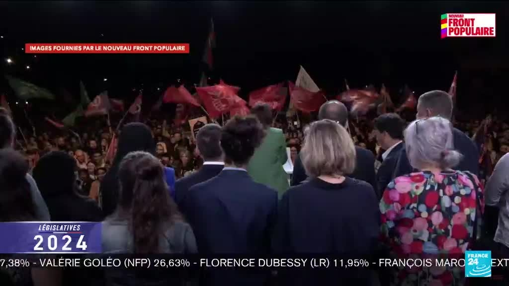 Le Rassemblement national (RN) et ses alliés sont arrivés en tête du premier tour des élections législatives (33,2 %), devant le Nouveau Front populaire (28,1 %), suivi par la majorité présidentielle Ensemble (21 %), et la droite et LR (10 %), selon les estimations de l'institut de sondage Ipsos Talan publiées à 21 h 56. Marine Tondelier s'est exprimée depuis la place de la République où de nombreux militants du Nouveau Front Populaire se sont rassemblés.