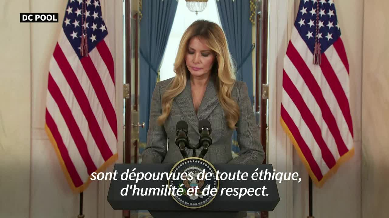 "Les mensonges qui m'associent à ce personnage infâme qu'est Jeffrey Epstein doivent cesser aujourd'hui", a déclaré Melania Trump devant les caméras, lors d'une apparition surprise jeudi à la Maison Blanche.