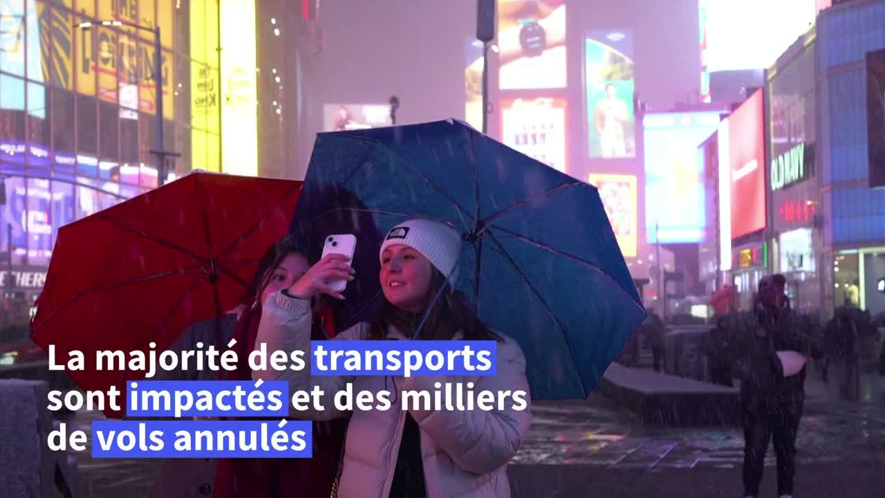 Quelques touristes bravent la tempête pour visiter Times Square à New York alors qu'une violente tempête de neige commence à frapper le nord-est des États-Unis. Le maire