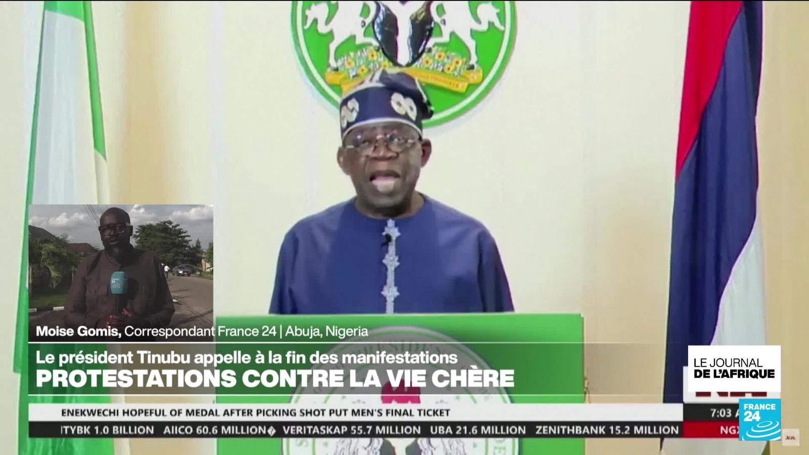 Le président nigérian Bola Ahmed Tinubu a appelé dimanche à la fin des manifestations contre la vie chère dans le pays le plus peuplé d'Afrique et à mettre un terme aux "effusions de sang", après qu'au moins 13 manifestants ont été tués par les forces de l'ordre selon Amnesty International. Les précisions de Moise Gomis, correspondant de France 24 dans la région.