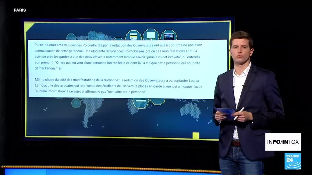 Une vidéo, des posts sur les réseaux sociaux et des articles de sites peu fiables prétendent qu’un étudiant pro-palestinien aurait été torturé par la police à Paris puis serait décédé chez lui début mai. De graves accusations niées par la justice. Parmi les manifestants, personne ne semble connaître ce prétendu étudiant. Tout laisse penser à une intox d'origine pro-russe totalement inventée.