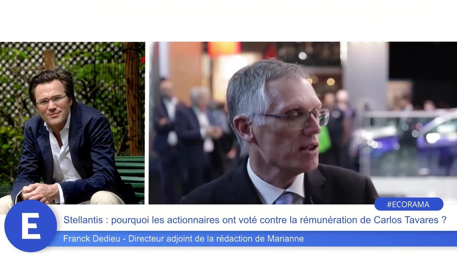 Les actionnaires de Stellantis ont voté à 52% contre le package de rémunération colossale de Carlos Tavares, de près de 66 millions d'euros. Au regard des bonnes performances du groupe, cette décision des actionnaires est-elle justifiée ? Sera-t-elle prise en compte par le conseil d'administration du constructeur automobile ? Les explications de Franck Dedieu, directeur adjoint de la rédaction de Marianne. Ecorama du 15 avril 2022, présenté par David Jacquot sur Boursorama.com
