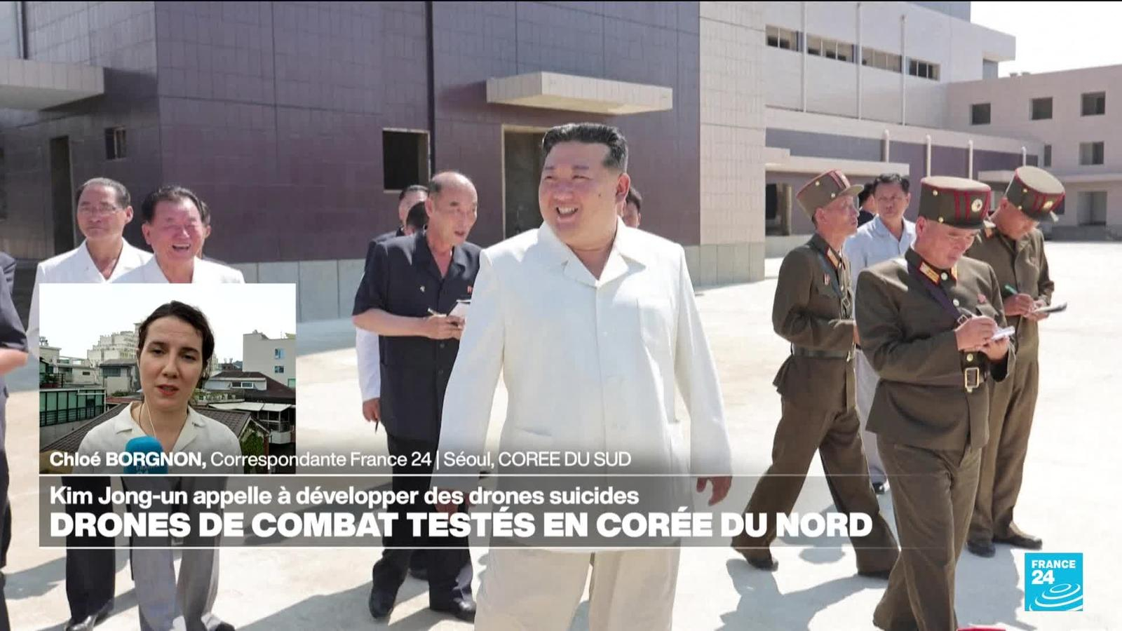La Corée du Nord a procédé à l'essai d'un nouveau type de drone explosif, a rapporté un média d'Etat lundi 26 août. Le dirigeant nord-coréen Kim Jong Un a supervisé le test de cette arme samedi, observant à l'aide de jumelles les drones faire exploser des cibles, selon des images diffusées par les médias d'Etat de Pyongyang. Les précisions de Chloé Borgnon, correspondante de France 24 en Corée du Sud.