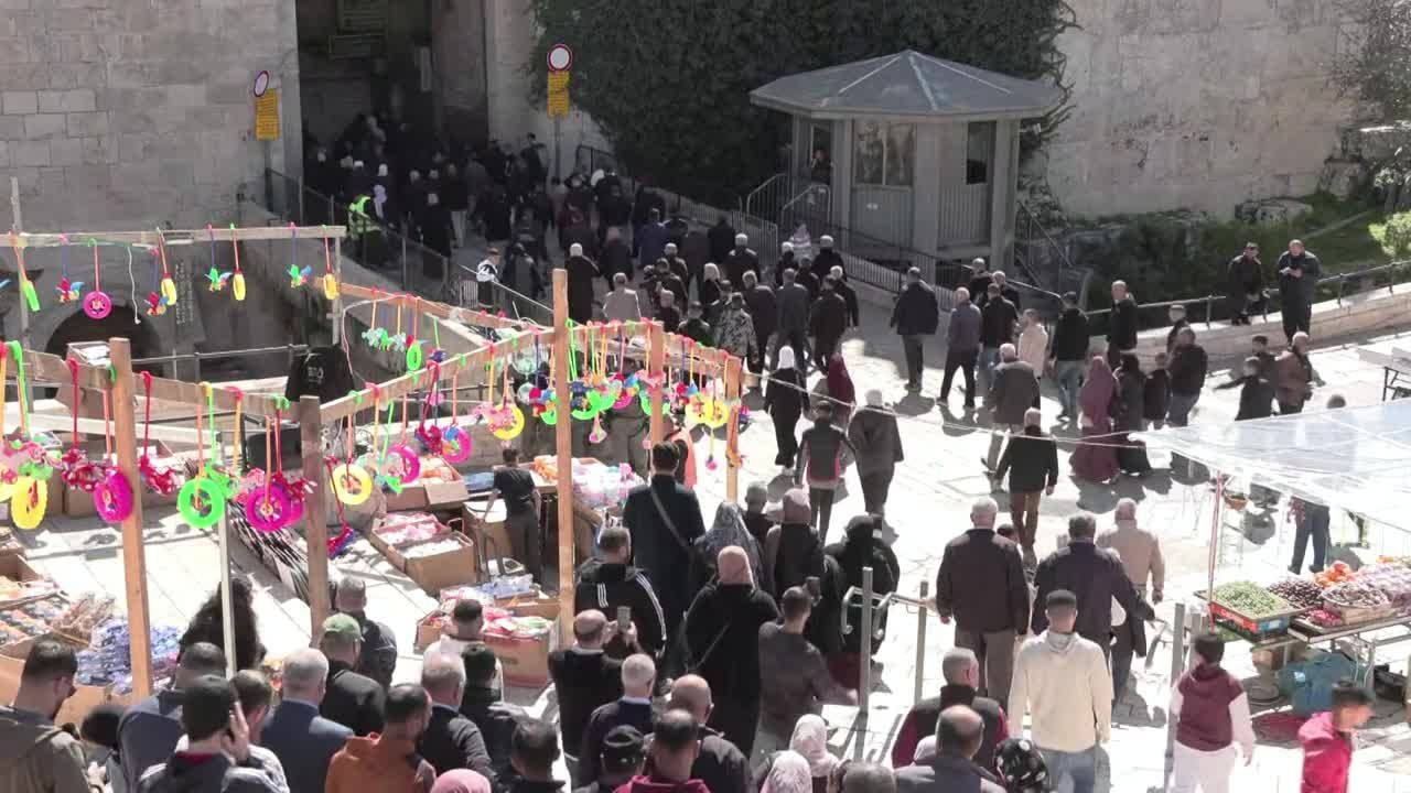 Des fidèles musulmans rejoignent la vieille ville de Jérusalem en passant par la porte de Damas pour accomplir les premières grandes prières du vendredi du ramadan sur l'esplanade des Mosquées. IMAGES
