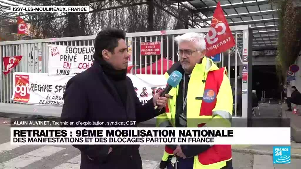 Les syndicats organisent ce jeudi 23 mars une neuvième journée de grèves et de manifestations contre la réforme des retraites, convaincus que "l'entêtement" du président de la République va renforcer la détermination des opposants. Alain Auvinet, technicien d'exploitation et membre du syndicat CGT, était sur France 24 pour parler de la situation.