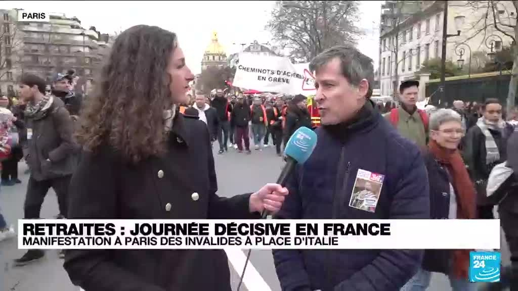 La France connaît mercredi 15 mars une nouvelle journée de mobilisation nationale contre le projet gouvernemental de réforme des retraites, lequel entre dans la dernière ligne droite de son examen au Parlement avec un vote définitif attendu jeudi qui devrait être très serré. Dans le cortège parisien, notre journaliste Jade Levin a pu s'entretenir avec des grévistes venus manifester.