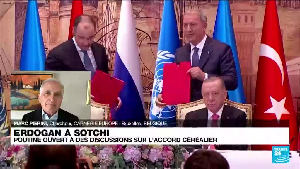 Un an après la fin de l’accord céréalier sur l’exportation des céréales ukrainiennes, Recep Tayyip Erdogan, le président de la Turquie est l’invité de Vladimir Poutine à Sotchi, en Russie ce lundi 4 septembre pour tenter de réactiver l’accord céréalier, suspendu par Vladimir Poutine. Quelle sera l’issue de cette rencontre ? Marc Piérini, chercheur au Carnegie Europe, ex-ambassadeur de l’Union européenne en Syrie et en Turquie est l’invité de France 24. Explications.