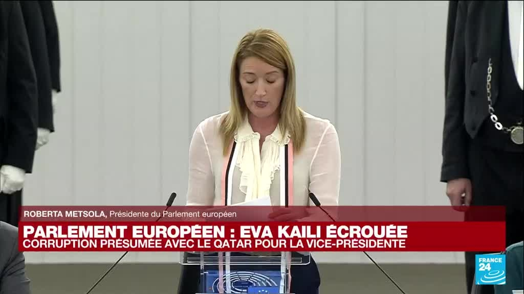 La vice-présidente grecque du Parlement européen Eva Kaili a été inculpée pour "corruption" dimanche 11 décembre à Bruxelles, et écrouée, dans l'enquête d'un juge belge portant sur de gros versements qu'aurait effectués le Qatar pour influencer des décisions au sein de cette grande institution de l'UE. Lors de la session plénière mensuelle du Parlement européen, sa présidente, Roberta Metsola, s'est exprimé sur cette affaire.