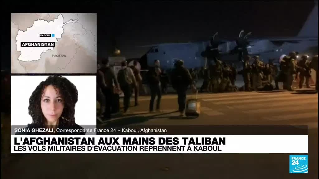 Les vols militaires d'évacuation de diplomates et de civils hors d'Afghanistan ont repris mardi matin à Kaboul et la France a procédé dans la nuit à sa première évacuation via le pont aérien reliant la capitale afghane à la base française des Emirats arabes unis (EAU). Notre correspondante pour FRANCE 24 Sonia Ghezali est en direct de Kaboul. "Rejoindre l'aéroport militaire de Kaboul est un défi", raconte-t-elle.