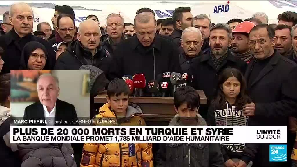 Turkish President Recep Tayyip Erdogan admitted for the first time Friday that his government's search and rescue effort from this week's devastating earthquake did not go as quickly as hoped. Erdogan has faced criticism from the quake's survivors about an insufficient number of rescuers and humanitarian aid being delivered in the first days of Turkey's biggest disaster in nearly a century. Pour Marc Pierini, chercheur à Carnegie Europe et l'ancien ambassadeur de l'UE en Syrie et en Turquie, c'est également un "séisme politique". Il estime que "c'est très compliqué" en Syrie avec la "situation militaire" au nord et le système du gouvernement en Turquie est "fortement centralisé", voire autocratique, empêchant les initiatives locales".