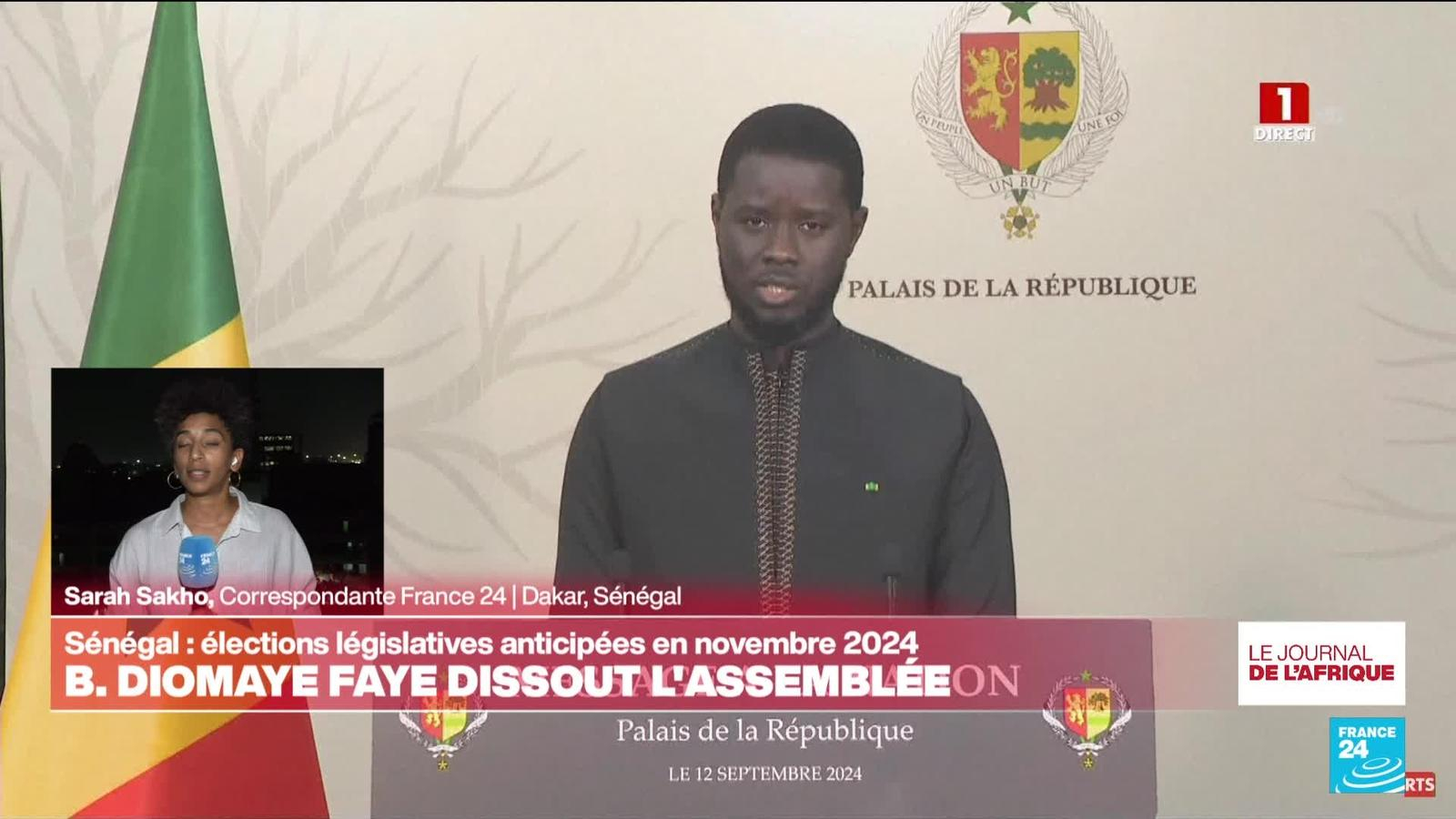 Le président sénégalais Bassirou Diomaye Faye a annoncé jeudi dissoudre l'Assemblée nationale et fixer des élections législatives le dimanche 17 novembre 2024, dans une adresse à la nation. Les précisions de Sarah Sakho, correspondante de France 24 à Dakar.