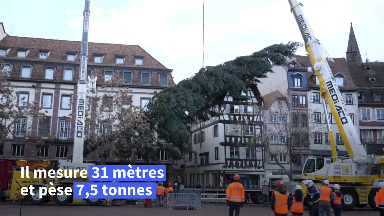 Un sapin de plus de trente mètres de haut et pesant 7,5 tonnes a été mis en place sur la place Kléber. C’est le premier signe visible des préparatifs du traditionnel marché de Noël à Strasbourg.