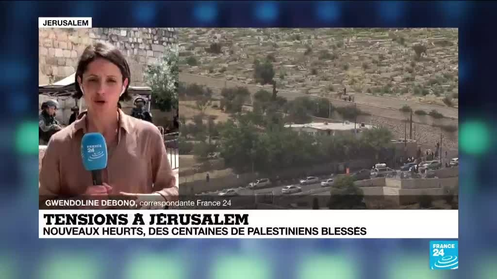 Jets de pierres, gaz lacrymogènes, balles en caoutchouc. De nouveaux affrontements entre Palestiniens et policiers israéliens ont fait lundi près de 300 blessés, en majorité palestiniens, sur l'esplanade des Mosquées à Jérusalem-Est, après un week-end de violences dans la Ville sainte. Les précisions de Gwendoline Debono, correspondante France 24 à Jérusalem.