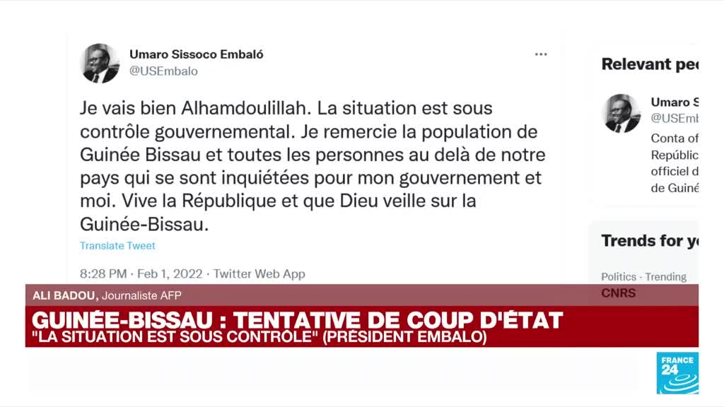 Tentative de coup d'État en Guinée-Bissau : "La situation est maintenant sous contrôle" information fournie par France 24 01/02/2022 à 21:49