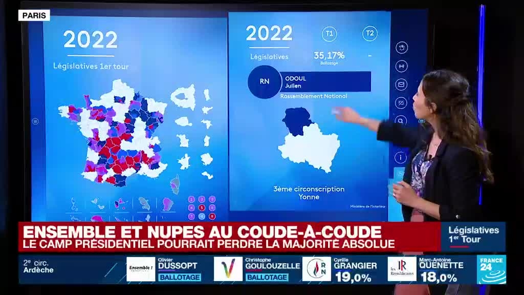 Tour d'horizon des premiers résultats du 1er tour des législatives françaises information fournie par France 24 12/06/2022 à 22:10