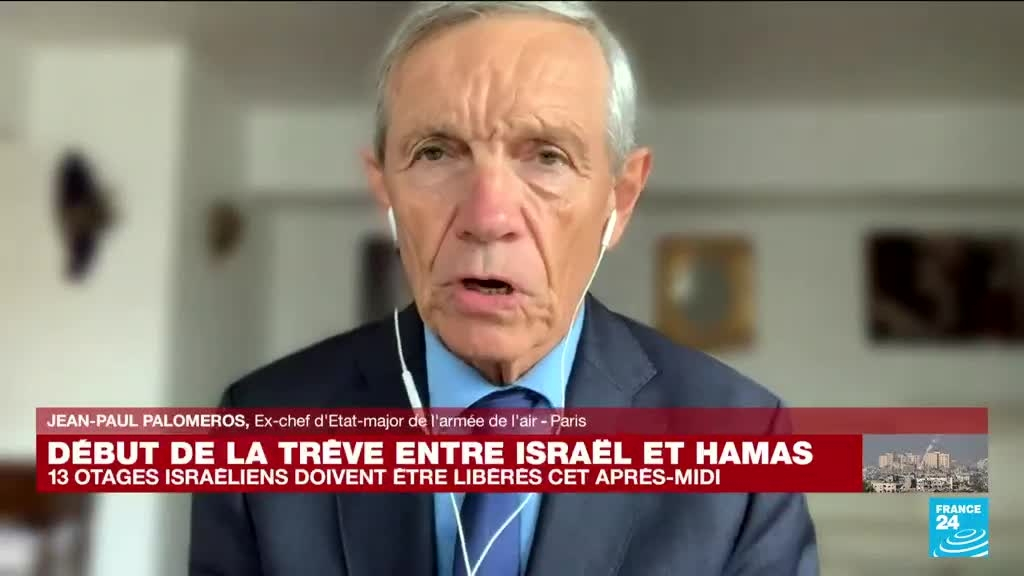 La trêve entre Israël et le mouvement islamiste Hamas dans la bande de Gaza est entrée en vigueur vendredi, et doit être assortie de la libération dans l'après-midi d'une dizaine d'otages contre des prisonniers palestiniens, premiers signes de répit après des semaines de guerre. L'analyse de Jean-Paul Palomeros, ex-chef d'Etat major de l'armée de l'air.