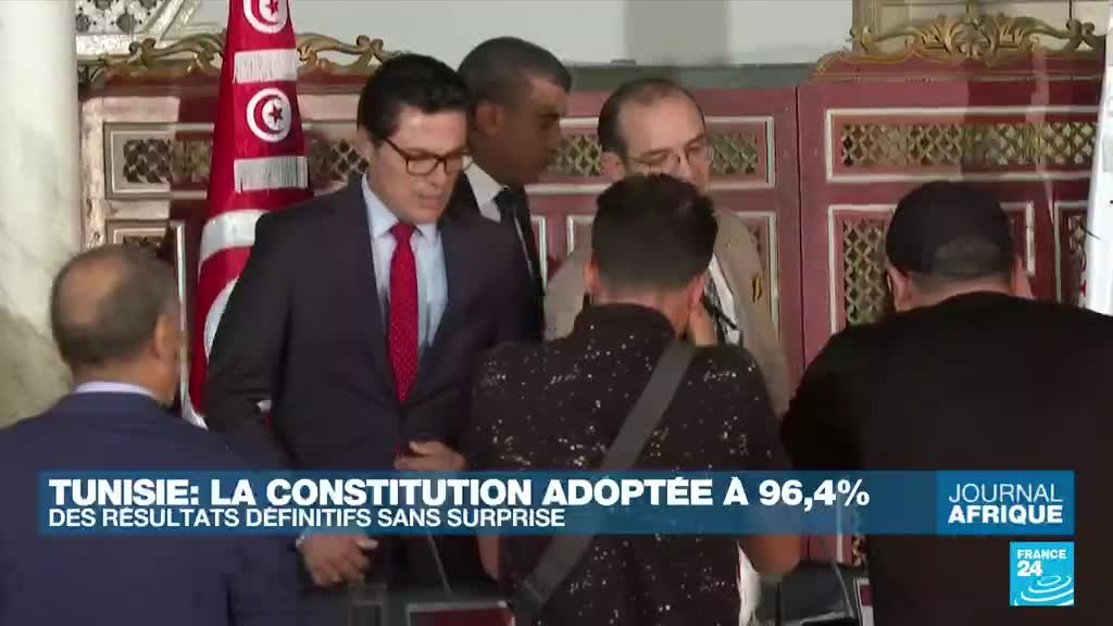 La nouvelle Constitution proposée par le président tunisien Kais Saied, qui renforce les pouvoirs du chef de l'Etat, a été adoptée à 94,6% des voix. Le texte entrera en vigueur après sa promulgation par le président et sa publication au journal officiel. Les précisions de Lilia Blaise, correspondante de France 24 à Tunis.