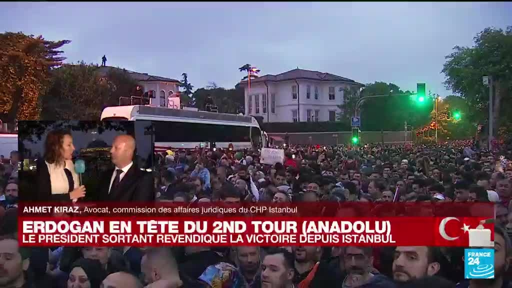 Le président Recep Tayyip Erdogan a revendiqué dimanche la victoire au second tour de l'élection présidentielle en Turquie. "Notre nation nous a confié la responsabilité de gouverner le pays pour les cinq prochaines années", a-t-il déclaré sur le toit d'un bus garé devant sa résidence stambouliote vers laquelle a convergé une foule enthousiaste. Ahmet Kiraz, avocat et membre du SHP Istanbul, le parti de Kemal Kiliçdaroglu, était sur France 24 pour évoquer les résultats.